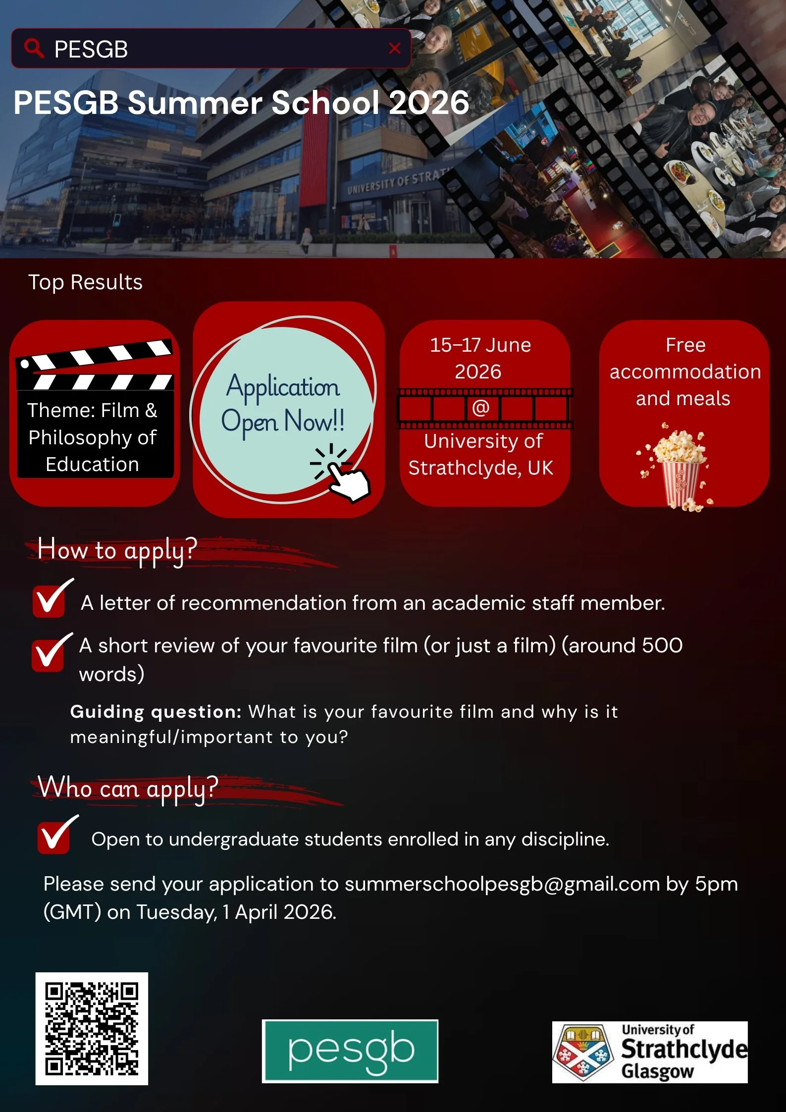 Undergraduate students are invited to apply for the 2026 Philosophy of Education Society of Great Britain (PESGB) Summer School, hosted by the University of Strathclyde in Glasgow. The 3-day Summer School will run from lunch time/Monday 15 June to lunchtime/Wednesday 17 June 2026. The Summer School involves one full day and two half-days of film screenings, discussions, lectures and social activities.